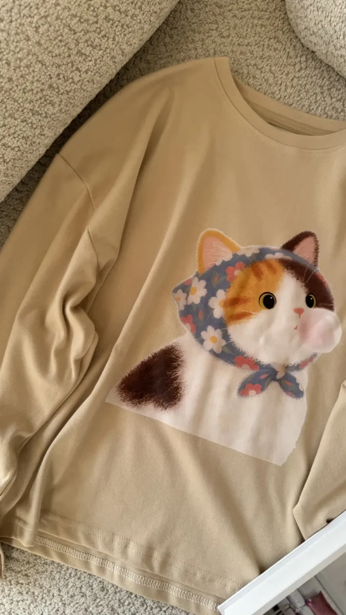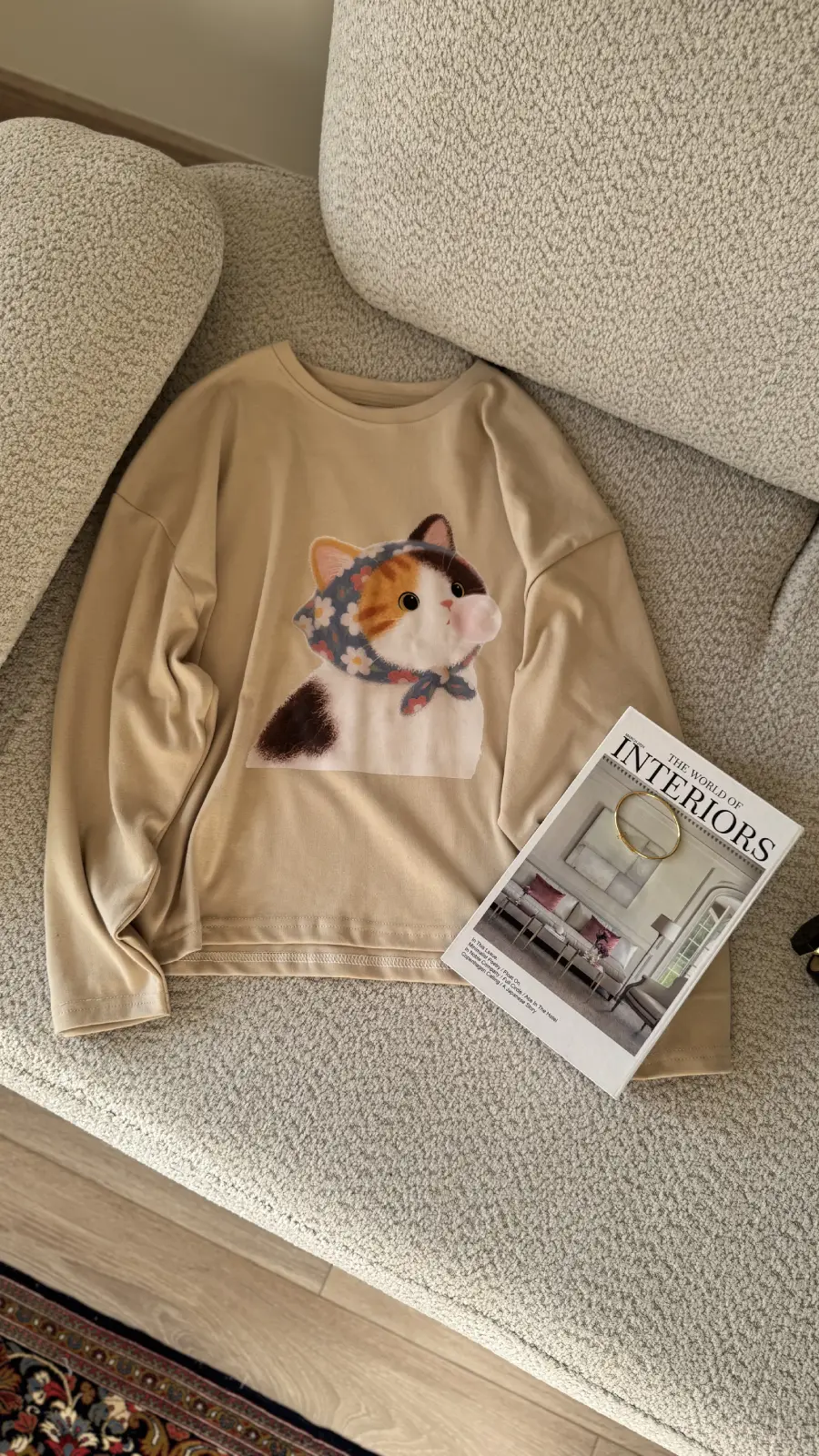 تیشرت طرح گربه ادامسی استین بلند دورو پنبه ضخیم
